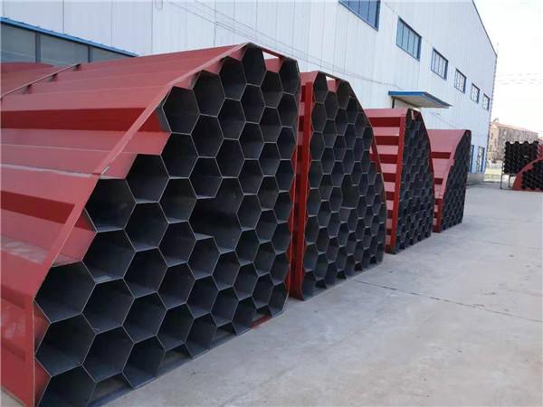 (3)蜂窩式電捕焦油器。蜂窩式與管式的結(jié)構(gòu)相同,是將通道截面由圓形改為正六邊形。兩個(gè)相鄰正六邊形共用一條邊,即靠中間的正六邊形的六條邊均被包圍它的六個(gè)正六邊形所共用。用2~3mm的鋼板制成的蜂窩板即可滿足工藝和機(jī)械強(qiáng)度的要求。由于蜂窩式電捕焦油器具有結(jié)構(gòu)緊湊合理、沒有電場(chǎng)空穴、有效空間利用率高、重量輕、耗鋼材少和捕集特性好等優(yōu)點(diǎn),但存在制造難度大,在運(yùn)輸安裝過程中易產(chǎn)生誤差等缺點(diǎn)。隨著設(shè)備制造工藝水平的提高,蜂窩式電捕焦油器的優(yōu)點(diǎn)會(huì)越來越受到人們的重視,必將逐步取代同心圓式和管式電捕焦油器。鈺泰環(huán)保生產(chǎn)蜂窩式電捕焦油器