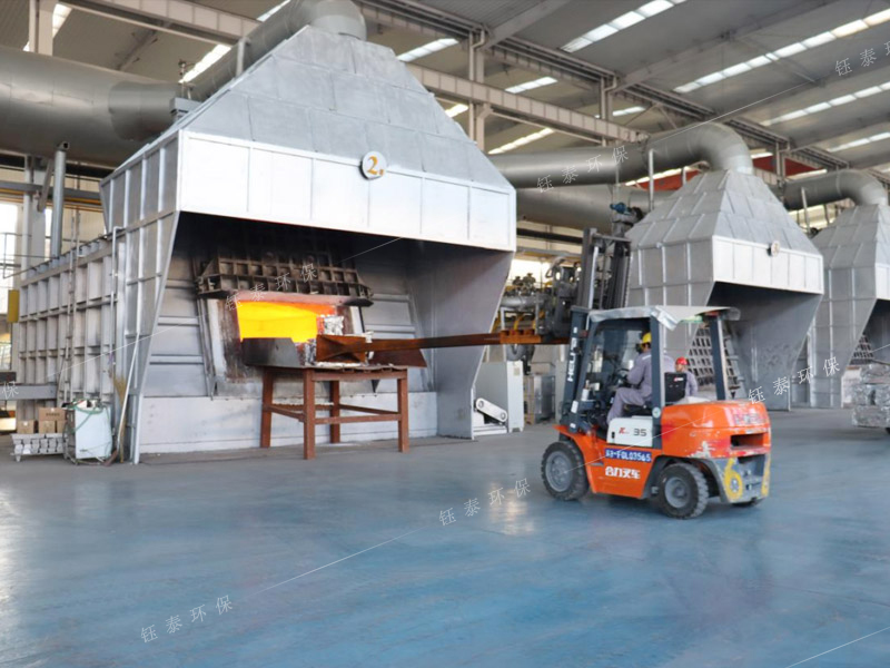 再生鋁雙室爐煙氣處理系統采用XLP高效旋風除塵器+強制排風冷卻器+脈沖布袋除塵器組成,雙室爐爐門排煙采用2個排煙罩,2個爐門罩交替打開;并配套爐膛排料輔助排煙系統,1套雙室爐煙氣處理系統處理風量≥130000m3/h。除塵器運行后將雙室爐燃燒過程產生的高溫煙氣(溫度<250℃)和爐門罩排出的煙氣全部收集干凈,保證了工人的操作環境,達到了規定的排放標準,給生產企業帶來了巨大的經濟效益。除塵器收集的顆粒污染物主要是熔煉過程中產生的金屬氧化物和非金屬氧化物,還有大量碳粒灰份等,除塵脫硫后:煙塵濃度:≤10mg/m3。